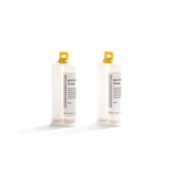 Silicone transparent par polyaddition fourni avec son système pratique de cartouches 1 : 1. Sa dureté de 70 Shore est idéale pour le transfert d’un wax-up en un mock-up directement en bouche.